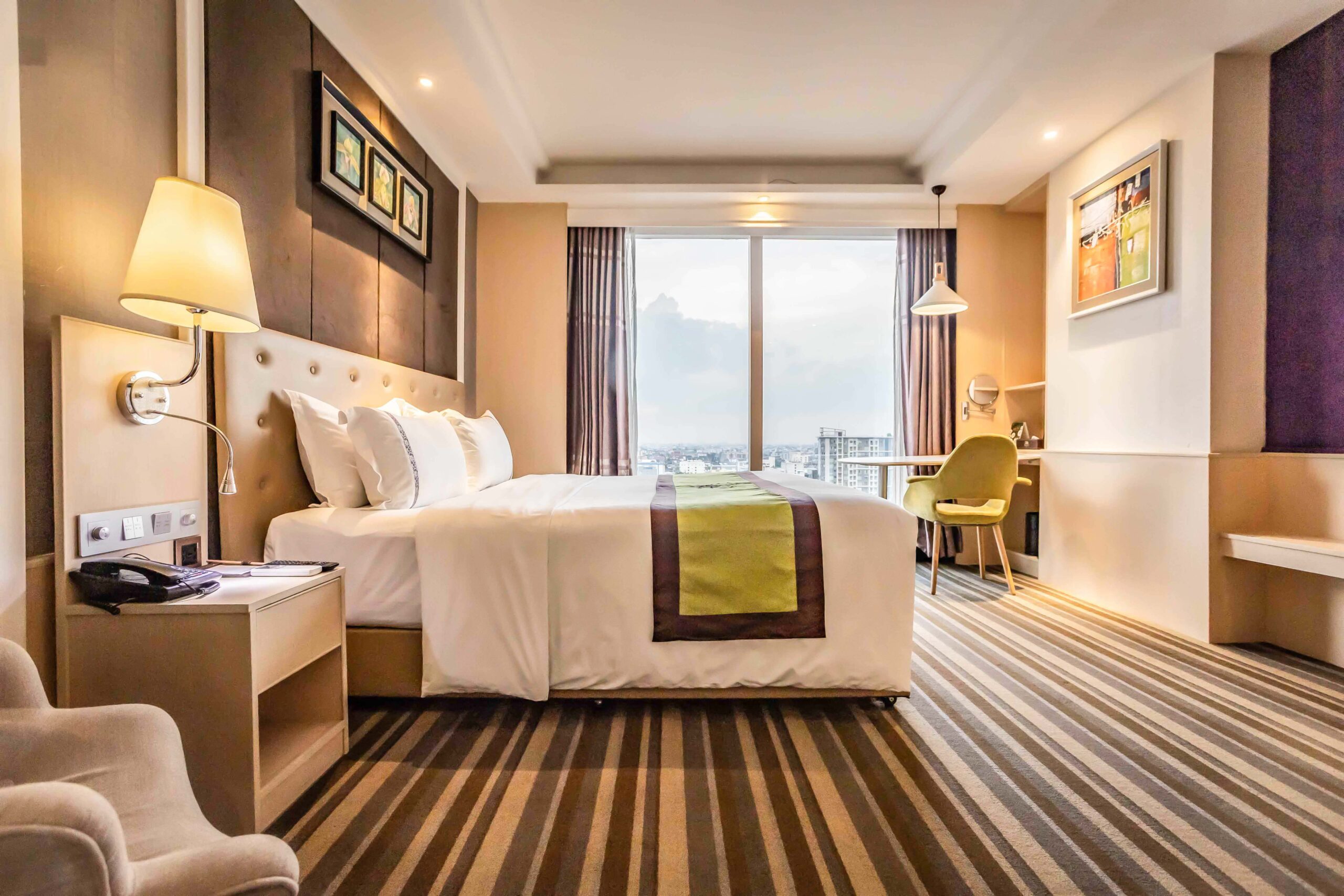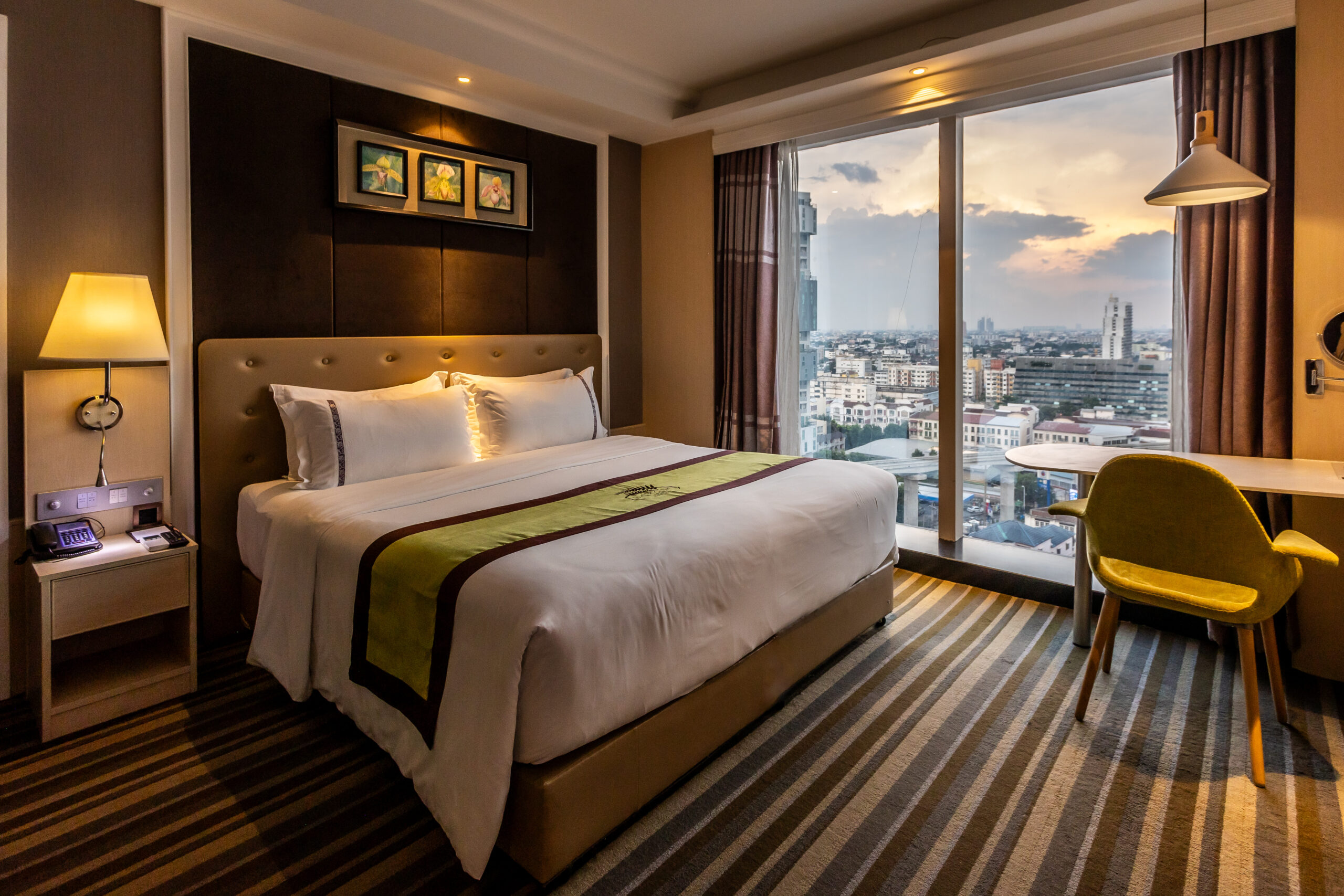 Our Deluxe Rooms are slightly more spacious than our Superior Rooms and are located on higher floors – all rooms come with a spectacular city view! With the option of a king or twin beds, guests can also select between carpeted (quieter and warming) or hardwood flooring (bright contemporary and cooler) in our deluxe room types.